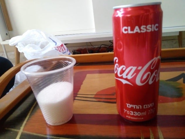 צפינו בסרטון שמראה את נזקי המשקאות המוגזים בגופנו (למי שיש בבית שן שרק נפלה מוזמן לעשות את ניסוי השן בקולה, ולבדוק מה קורה לה בכל יום) והדגמנו בעזרת כוס ריקה וסוכר כמה כפיות סוכר יש בכל פחית של משקה מוגז.