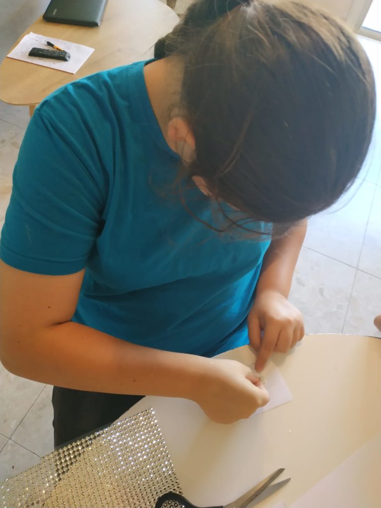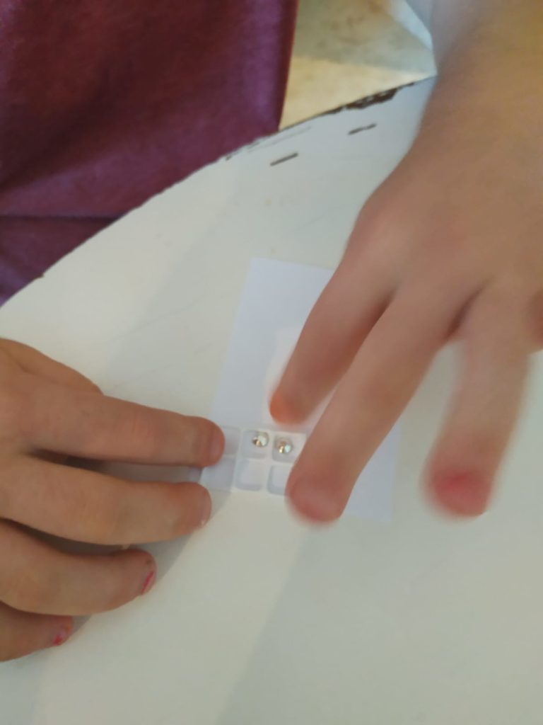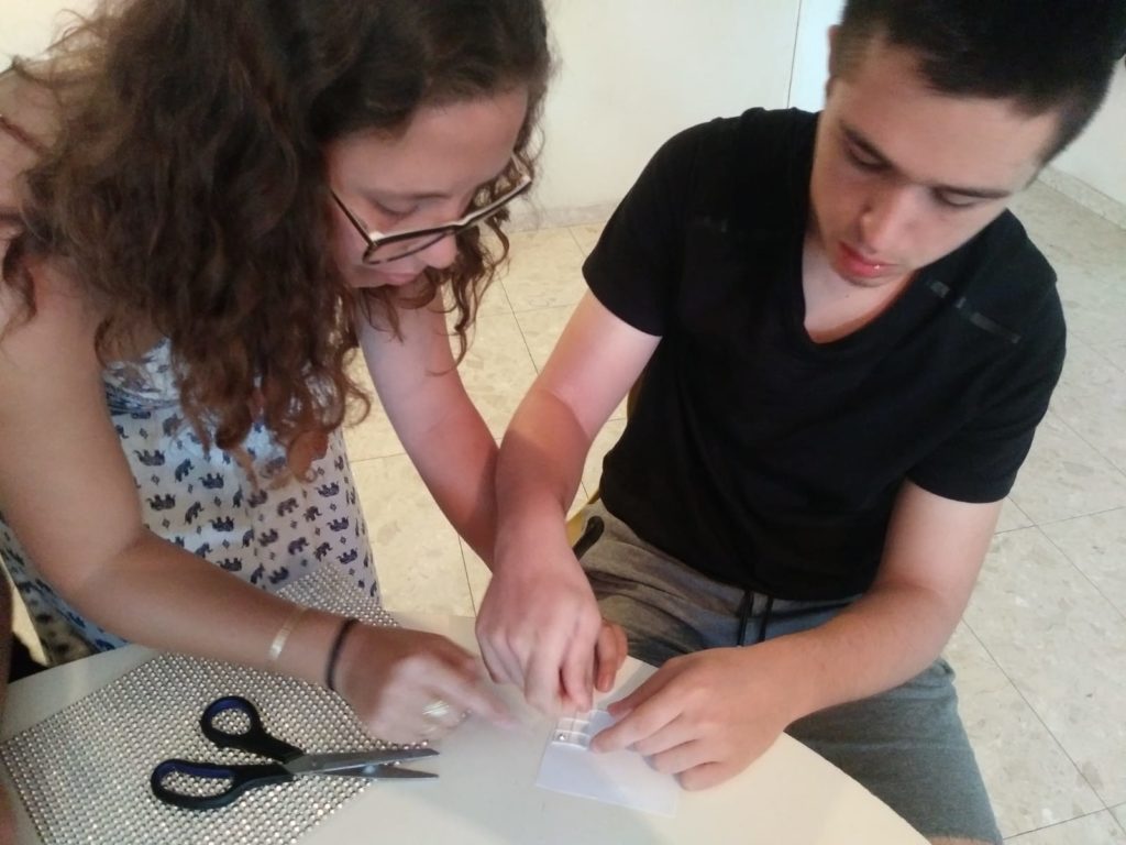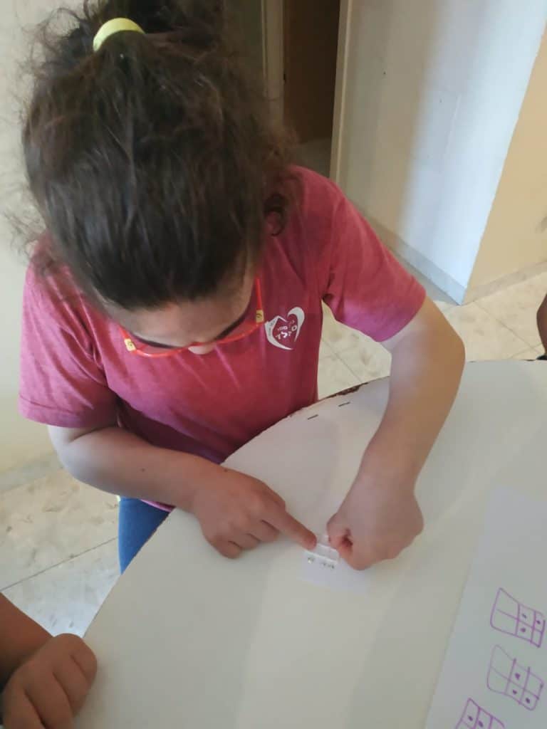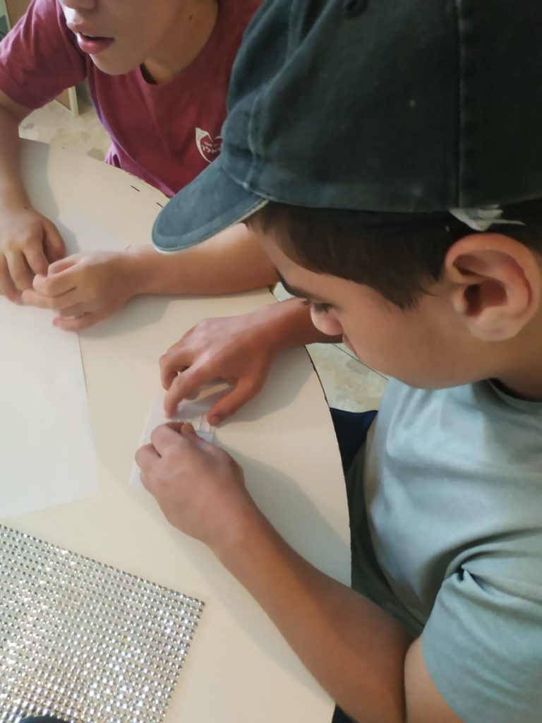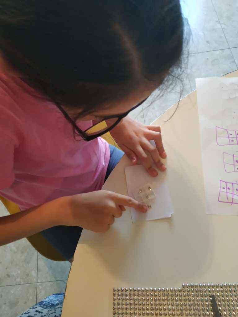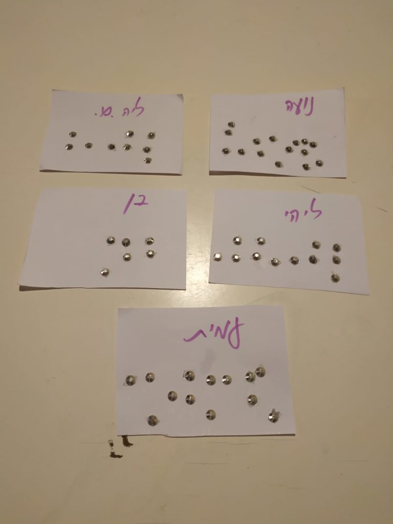 לאחר מכן התנסנו בעצמנו בכתב ברייל. איך עשינו זאת? כתבנו את השמות שלנו בעזרת מדבקות בולטות לפי אותיות כתב הברייל. על מנת ליצור מבנה של 3X2 ולדייק את מיקום המדבקות, השתמשנו ברשת יונים.