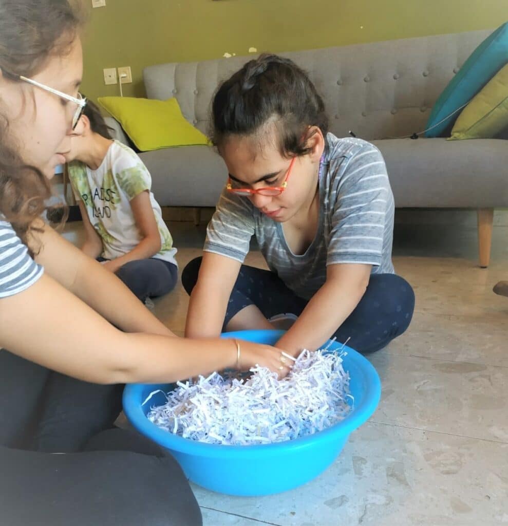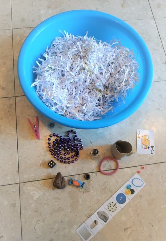 התחלנו את יומינו בבינגו חוש המישוש. איך משחקים? מכניסים את היד לתוך גיגית עם נייר גרוס וצריך לזהות את החפץ שמרגישים. אם מזהים נכון מסמנים את החפץ על הלוח. משחק מהנה ומסקרן 🙂